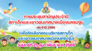 ขอเชิญชวนน้อง ๆ เด็กและเยาวชนคนเก่ง มาร่วมเป็นส่วนหนึ่งของการพัฒนาเมืองของเรา ในการประชุมสามัญประจำปีสภาเด็กและเยาวชนเทศบาลเมืองนครปฐม ประจำปี 2569