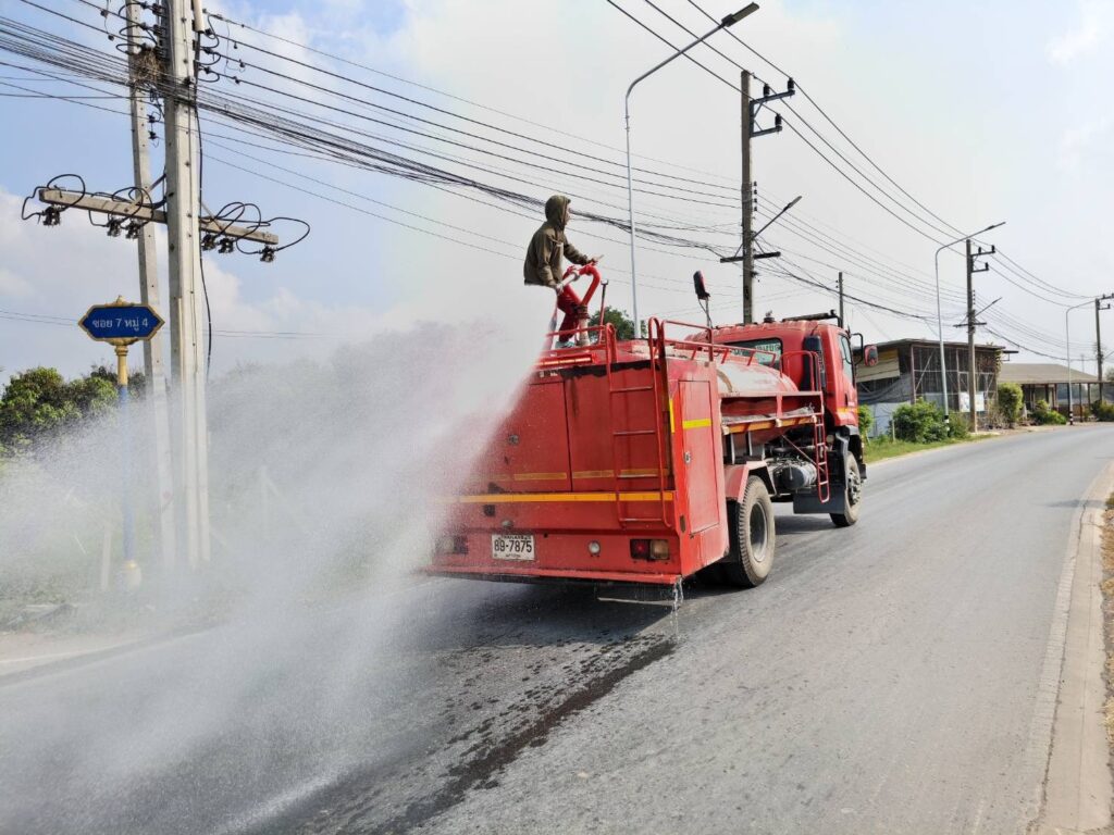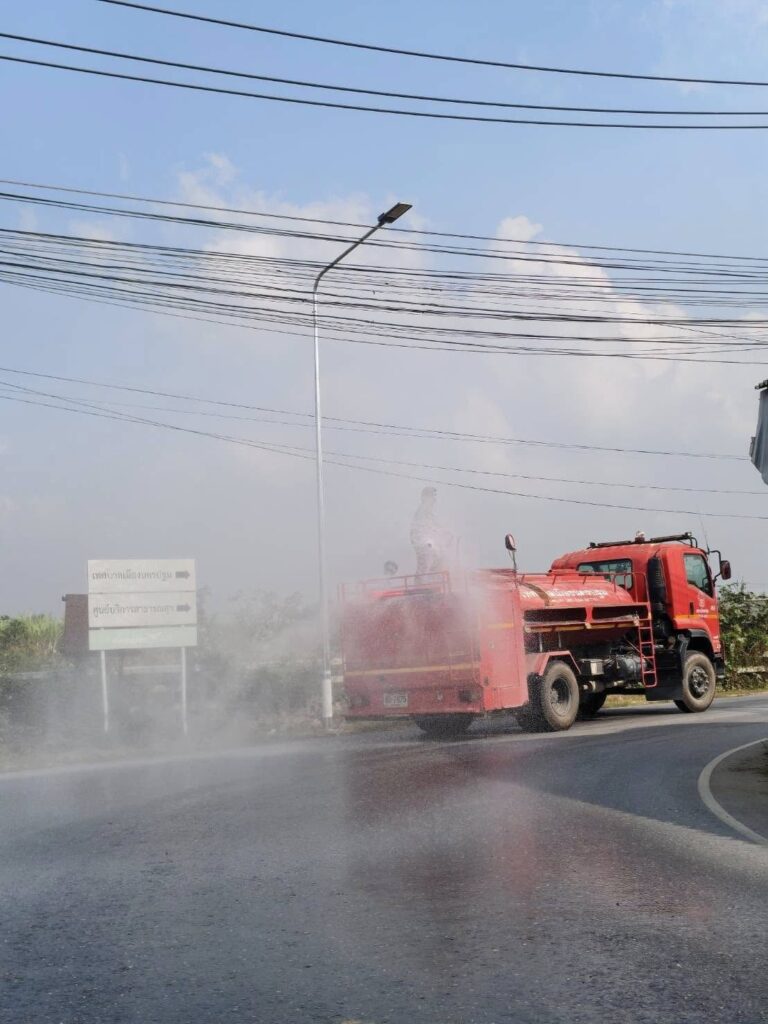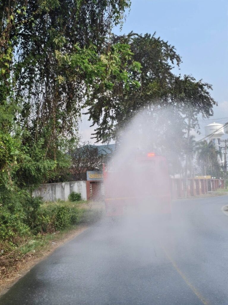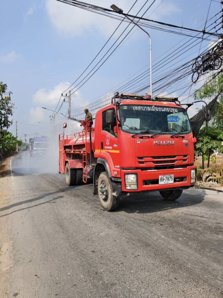 ดำเนินการนำรถบรรทุกน้ำออกฉีดพ่นน้ำเพิ่มความชุ่มชื้นในอากาศโดยรอบ บริเวณแยกพรชัย – โรงท่อ เพื่อบรรเทาปัญหาฝุ่นละอองขนาดเล็กสูงเกินมาตรฐาน จนส่งผลกระทบต่อสุขภาพของประชาชนตำบลนครปฐม