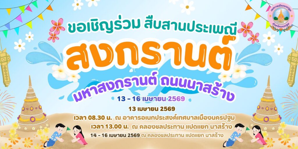 เทศบาลเมืองนครปฐม ขอเชิญพี่น้องชาวนครปฐมและนักท่องเที่ยวทุกท่าน มาร่วมสนุกและสืบสานประเพณีวิถีไทยในงานสงกรานต์