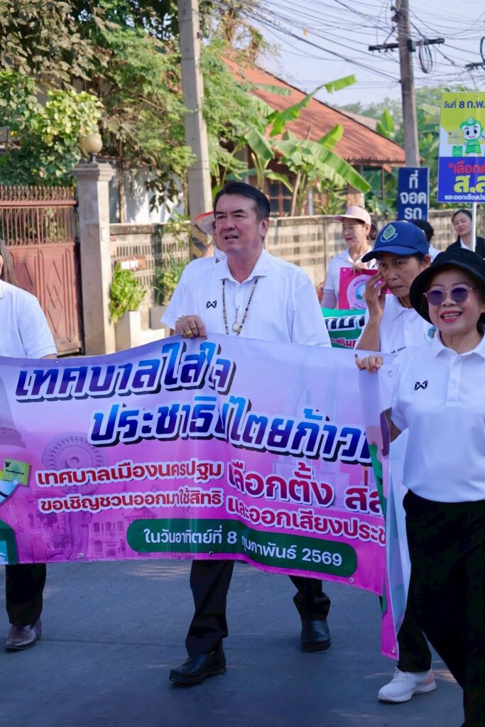 นายณัทพงศ์ ถ้ำเพชร์ นายกเทศมนตรีเมืองนครปฐม พร้อมด้วยคณะผู้บริหาร สมาชิกสภาเทศบาล พนักงานเทศบาลเมืองนครปฐมและผู้นำชุมชน ได้ร่วมเดินประชาสัมพันธ์เพื่อเชิญชวนพี่น้องประชาชนในเขตพื้นที่ ออกไปใช้สิทธิเลือกตั้งสมาชิกสภาผู้แทนราษฎร (สส.) และลงคะแนนออกเสียงประชามติในวันอาทิตย์ที่ 8 กุมภาพันธ์ 2569